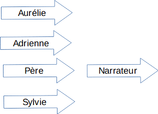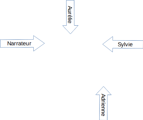 Plaçons le narrateur et les 3 filles, Adrienne, Sylvie et Aurélie. Le narrateur se place face à Sylvie, Aurélie les regarde et Adrienne va dans un coin car elle veut mourir.
